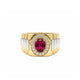 14KT yellow gold ring featuring an oval ruby framed by a halo of brilliant diamonds and accented with sleek gold details. A bold, timeless design radiating elegance and sophistication.