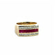 14KT yellow gold ring featuring baguette-cut rubies framed by two sparkling diamond rows. A striking, elegant design that blends vibrant color with timeless sophistication for everyday wear or special occasions.